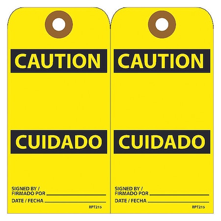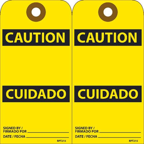 RPT215G, Caution Bilingual Tag Tags, Caution, Blank, Bilingual, 25pk, 6x3, .015 Unrippable Vinyl With Grommet, Zip Ties Included