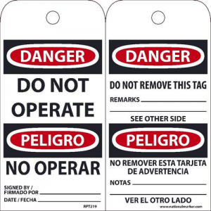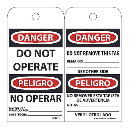 NMC RPT219, Danger Do Not Operate" Bilingual Tag (12 Packs of 25 pcs)
