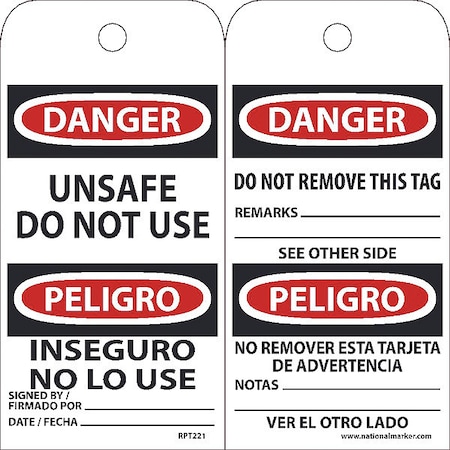 RPT221, Danger Unsafe Do Not Use Bilingual Tag Tags, Danger, Unsafe Do Not Use, Bilingual, 25pk, 6x3, .010 Synthetic Paper With 1 Top Center Hole, Zip Ties Included