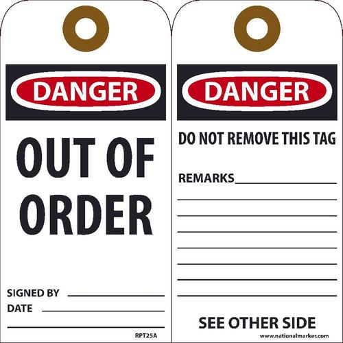 RPT25AG, Danger Out Of Order Tag Tags, Danger Out Of Order Tag, 25pk, 6x3, .015 Unrippable Vinyl With Grommet, Zip Ties Included