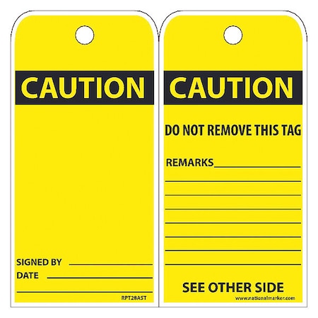 RPT28AST, Caution Signed By, Date Tag Tags, Caution, Do Not Remove, 25pk, 6x3, .010 Synthetic Paper With 1 Top Center Hole, Zip Ties Included
