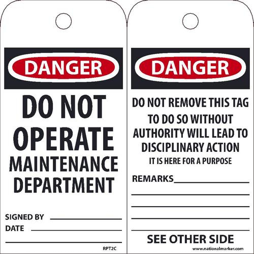 - Tag Legend: the front side legend reads DANGER - DO NOT OPERATE MAINTENANCE DEPARTMENT. The back-side legend is DANGER - DO NOT REMOVE THIS TAG - TO DO SO WITHOUT AUTHORITY WILL LEAD TO DISCIPLINARY ACTION! IT IS HERE FOR A PURPOSE