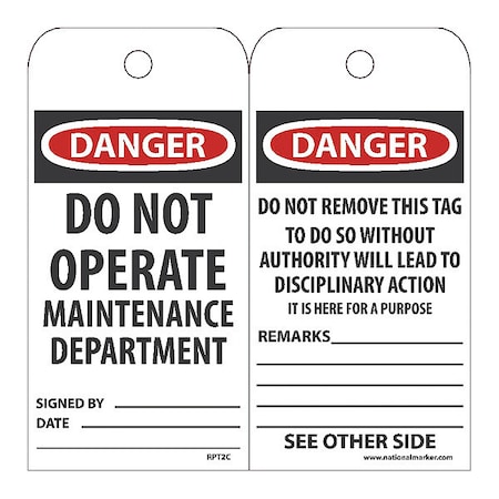 NMC RPT2C Danger - DO NOT Operate Maintenance Department Tag - [Pack of 25] 3 in. x 6 in. 2 Sided Vinyl Danger Tag with White/Black Text on Red/White Base