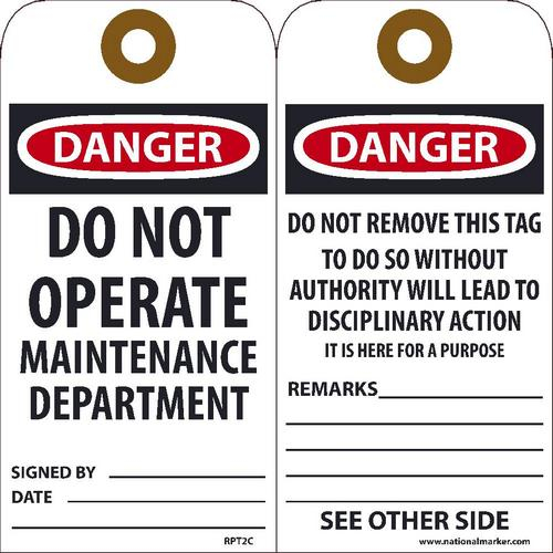 - Tag Legend: the front side legend reads DANGER - DO NOT OPERATE MAINTENANCE DEPARTMENT. The back-side legend is DANGER - DO NOT REMOVE THIS TAG - TO DO SO WITHOUT AUTHORITY WILL LEAD TO DISCIPLINARY ACTION! IT IS HERE FOR A PURPOSE