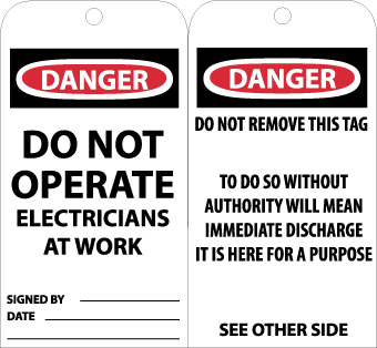 - Header "DANGER" and legend "DO NOT OPERATE ELECTRICIANS AT WORK" and "DO NOT REMOVE THIS TAG, TO DO SO WITHOUT AUTHORITY WILL MEAN IMMEDIATE DISCHARGE IT IS HERE FOR A PURPOSE"
