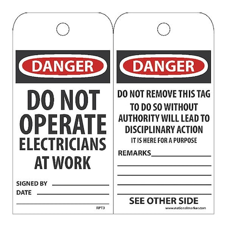 NMC RPT3 "Danger - DO NOT Operate Electricians at Work" Accident Prevention Tag, Unrippable Vinyl, 3" Length, 6" Height, Red, Black/Red on White (Pack of 25)
