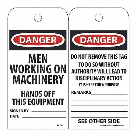 NMC RPT31"Danger - Men Working ON Machinery Hands Off This Equipment" Accident Prevention Tag, Unrippable Vinyl, 3" Length, 6" Height, Black/Red on White (Pack of 25)