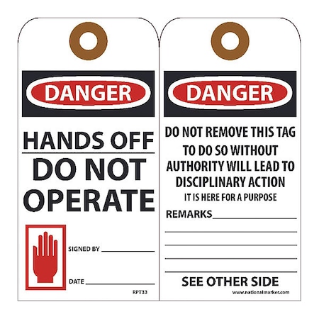 NMC RPT33G Danger Hands Off DO NOT Operate Tag - [Pack of 25] 3 in. x 6 in. 2 Side Vinyl Accident Prevention Tag with White/Black Text on Red/White Base