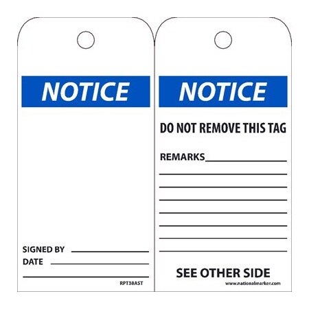 NMC RPT38AST Safety Sign Tags, Notice, 25Pk, 6X3.010 Synthetic Paper with 1 Top Center Hole, Zip Ties Included