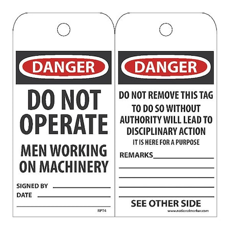 NMC RPT4 "Danger - DO NOT Operate Men Working ON Machinery" Accident Prevention Tag, Unrippable Vinyl, 3" Length, 6" Height, Black/Red on White (Pack of 25)