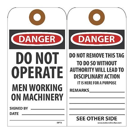 NMC RPT4G "Danger - DO NOT Operate Men Working ON Machinery" Accident Prevention Tag with Brass Grommet, Unrippable Vinyl, 3" Length, 6" Height, Black/Red on White (Pack of 25)