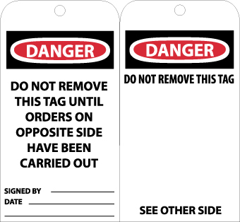 - Header "DANGER" and legend "DO NOT REMOVE THIS TAG UNTIL ORDERS ON OPPOSITE SIDE HAVE BEEN CARRIED OUT" and "DO NOT REMOVE THIS TAG"
