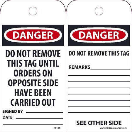NMC RPT66 "Danger - DO NOT Remove This TAG Until Orders ON Opposite Side Have Been Carried Out" Accident Prevention Tag, Unrippable Vinyl, 3" Length, 6" Height, Black/Red on White (Pack of 25)