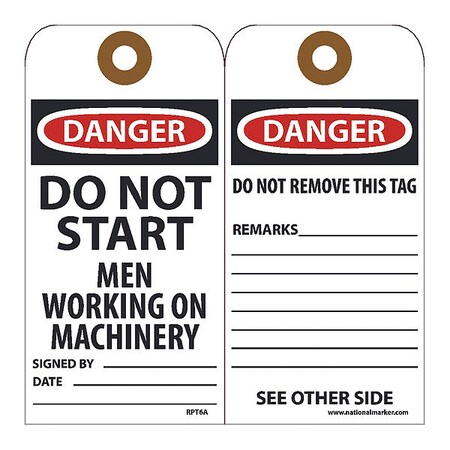 RPT6AG, Danger Do Not Start Men Working On Machinery Tag Tags, Danger Do Not Start Men Working On Machinery Tag, 25pk, 6x3, .015 Unrippable Vinyl With Grommet, Zip Ties Included