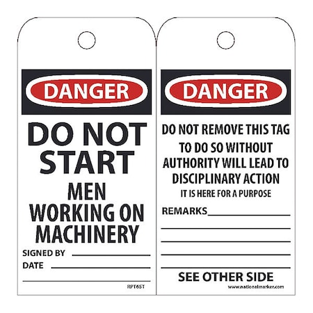 RPT6ST, Danger Do Not Start Men Working On Machinery Tag Tags, Danger Do Not Start Men Working On Machinery Tag, 25pk, 6x3, .010 Synthetic Paper With 1 Top Center Hole, Zip Ties Included