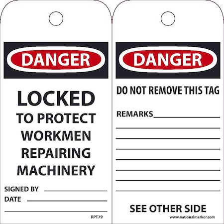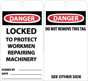 - Header "DANGER" and legend "LOCKED TO PROTECT WORKMEN REPAIRING MACHINERY" and "DO NOT REMOVE THIS TAG"