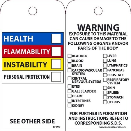 | Feature | Front of tag displays an HMIS color bar, with blank spaces for ratings, to describe the levels of hazards presented by the tagged material |