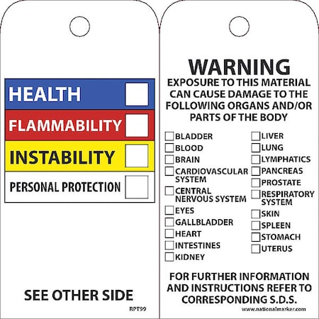 - Front of tag displays an HMIS color bar, with blank spaces for ratings, to describe the levels of hazards presented by the tagged material
