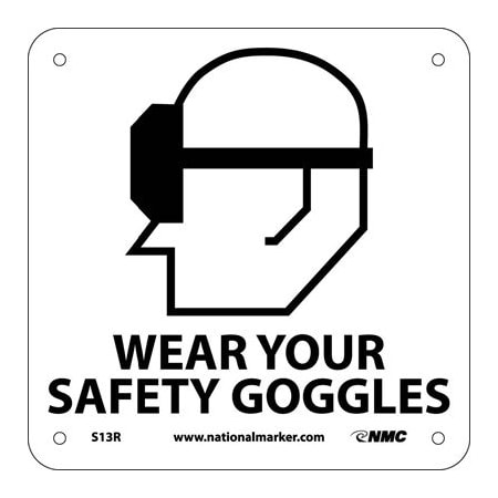 NMC S13R PPE Sign, Legend "WEAR YOUR SAFETY GOGGLES" with Graphic, 7" Length x 7" Height, Rigid Plastic, Black on White