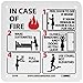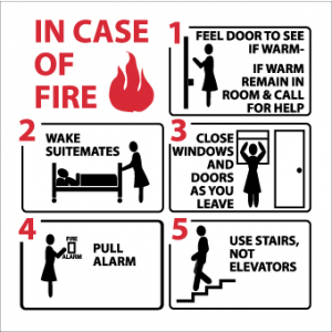 - Visibility: the sign shows graphics, instructions, and the legend “IN CASE OF FIRE” in contrasting colors and clear, bold letters to ensure easy visibility in most lighting conditions and even from a distance
