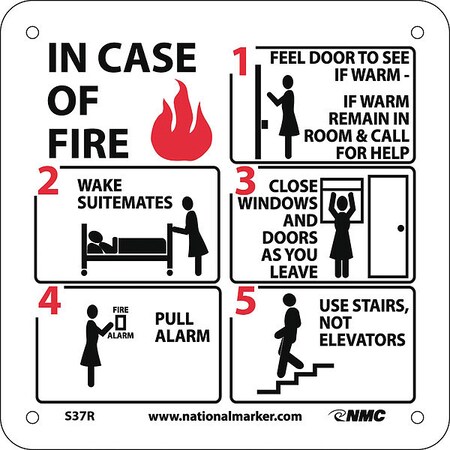 NMC S37R Hotel Motel Fire Emergency Instructions Graphic See Sign, Legend "IN CASE OF FIRE", 7" Height, x 7" Length, Rigid Plastic, Black/Red on White