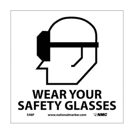 NMC S48P WEAR YOUR SAFETY GLASSES Sign - 7 in. Square Pressure Sensitive Vinyl Safety Sign, Head with Safety Glasses Graphic, Black Text on White Base