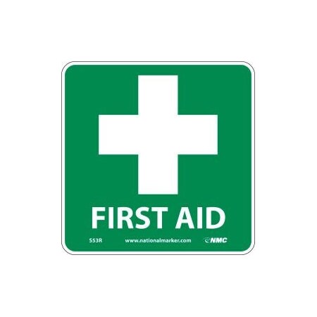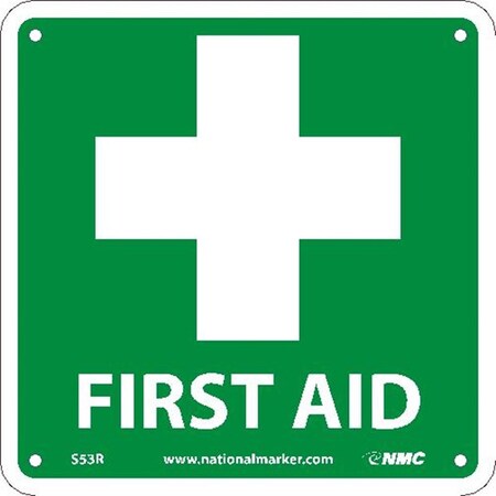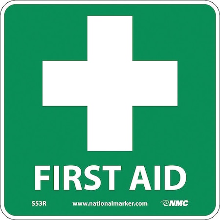 NMC S53R 7" x 7" Emergency and First Aid Sign -First Aid (w/Graphic), Rigid Plastic, Pack of 50 pcs