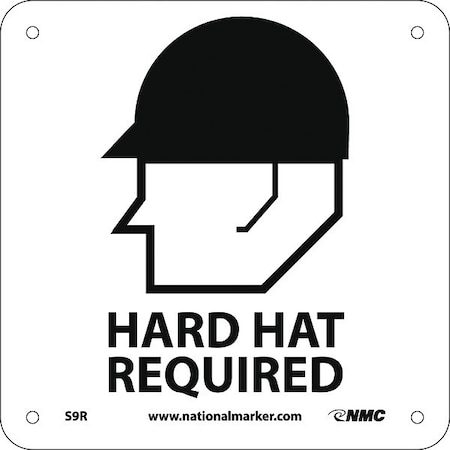 NMC S9R HARD HAT REQUIRED Sign – 7 in. Square Rigid Plastic PPE Sign with Head in Hard Hat Graphic, Black Text on White Base