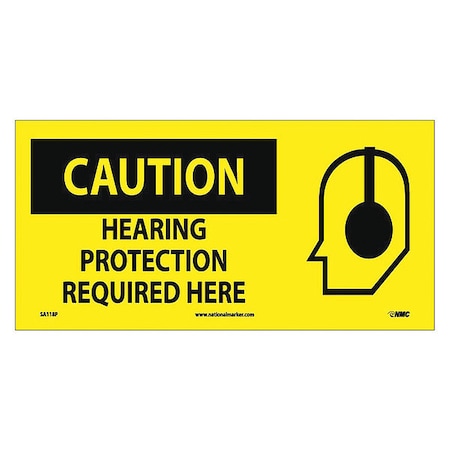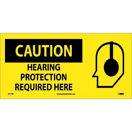 NMC SA118P 7" x 17" Graphic OSHA Safety Sign w/Legend:Caution, Hearing Protection Required Here, PS Vinyl, Pack of 50 pcs