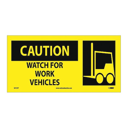 NMC SA122P Graphic OSHA Safety Sign, Legend "CAUTION - WATCH FOR WORK VEHICLES" with Graphic, 17" Length x 7" Height, Pressure Sensitive Vinyl, Black on Yellow