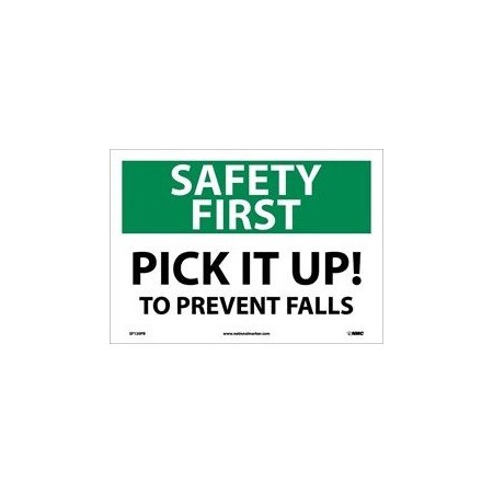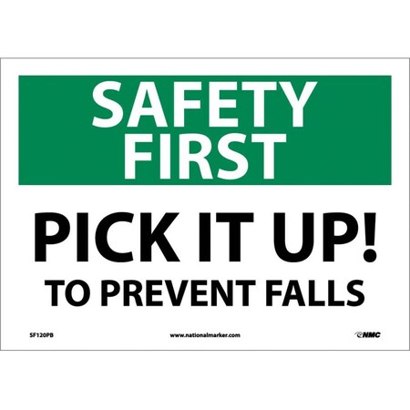 NMC SF120PB OSHA Sign, Legend "SAFETY FIRST - PICK IT UP! TO PREVENT FALLS", 14" Length x 10" Height, Pressure Sensitive Vinyl, Black/Green on White