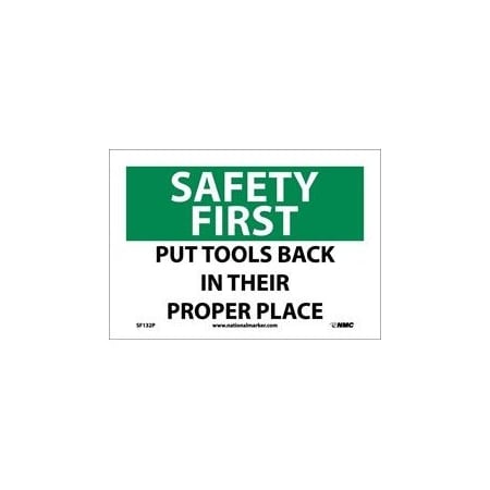 NMC SF132P OSHA Sign, Legend "SAFETY FIRST - PUT TOOLS BACK IN THEIR PROPER PLACE", 10" Length x 7" Height, Pressure Sensitive Vinyl, Black/Green on White