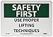 | Feature | Header "SAFETY FIRST" and legend "USE PROPER LIFTING TECHNIQUES" |