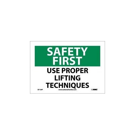 NMC SF134R OSHA Sign, Legend "SAFETY FIRST - USE PROPER LIFTING TECHNIQUES", 10" Length x 7" Height, Rigid Plastic, Black/Green on White