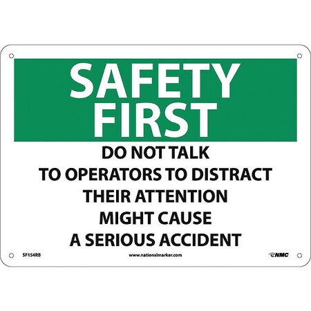 NMC SF154RB OSHA Sign, Legend "SAFETY FIRST - DO NOT TALK TO OPERATORS TO DISTRACT THEIR ATTENTION MIGHT CAUSE A SERIOUS ACCIDENT", 14" Length x 10" Height, Rigid Plastic, Black/Green on White