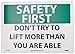 | Feature | Header "SAFETY FIRST" and legend "DON\'T TRY TO LIFT MORE THAN YOU ARE ABLE" |