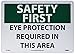 | Feature | Header "SAFETY FIRST" and legend "EYE PROTECTION REQUIRED IN THIS AREA" |