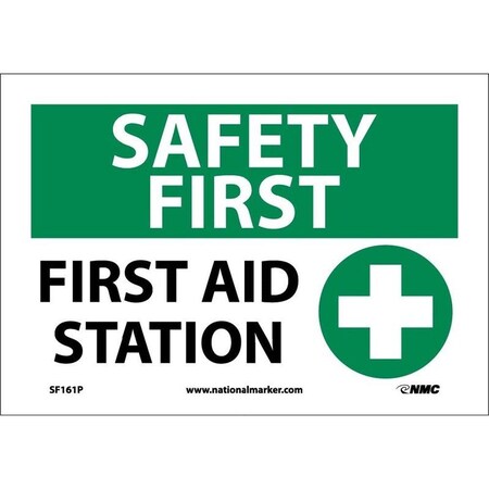 NMC SF161PB OSHA Sign, Legend "SAFETY FIRST - FIRST AID STATION" with Graphic, 14" Length x 10" Height, Pressure Sensitive Vinyl, Black/Green on White