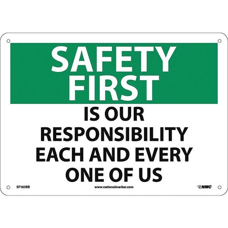 NMC SF165RB OSHA Sign, Legend "SAFETY FIRST - IS OUR RESPONSIBILITY EACH AND EVERY ONE OF US", 14" Length x 10" Height, Rigid Plastic, Black/Green on White