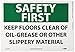 | Feature | Header "SAFETY FIRST" and legend "KEEP FLOORS CLEAR OF OIL-GREASE OR OTHER SLIPPERY MATERIAL" |