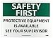| Feature | Header "SAFETY FIRST" and legend "PROTECTIVE EQUIPMENT IS AVAILABLE SEE YOUR SUPERVISOR" |