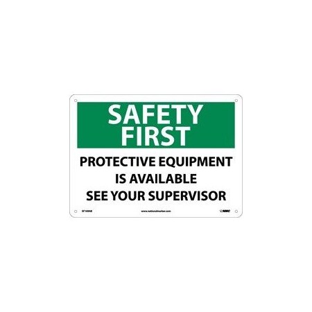 NMC SF169RB OSHA Sign, Legend "SAFETY FIRST - PROTECTIVE EQUIPMENT IS AVAILABLE SEE YOUR SUPERVISOR", 14" Length x 10" Height, Rigid Plastic, Black/Green on White