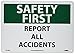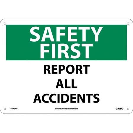 NMC SF170AB OSHA Sign, Legend "SAFETY FIRST - REPORT ALL ACCIDENTS", 14" Length x 10" Height, Aluminum, Black/Green on White