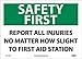 | Feature | Header "SAFETY FIRST" and legend "REPORT ALL INJURIES NO MATTER HOW SLIGHT TO FIRST AID STATION" |