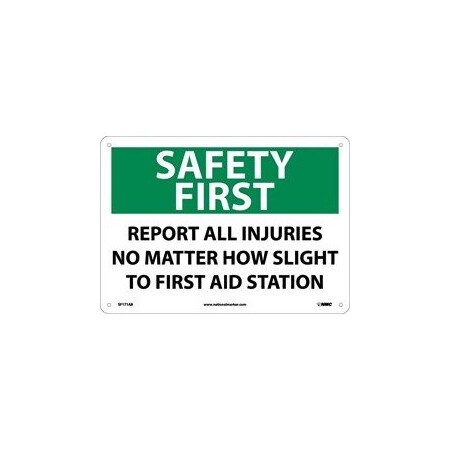 NMC SF171PB OSHA Sign, Legend "SAFETY FIRST - REPORT ALL INJURIES NO MATTER HOW SLIGHT TO FIRST AID STATION", 14" Length x 10" Height, Pressure Sensitive Vinyl, Black/Green on White