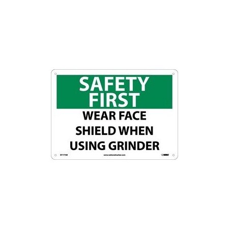 NMC SF177AB OSHA Sign, Legend "SAFETY FIRST - WEAR FACE SHIELD WHEN USING GRINDER", 14" Length x 10" Height, Aluminum, Black/Green on White