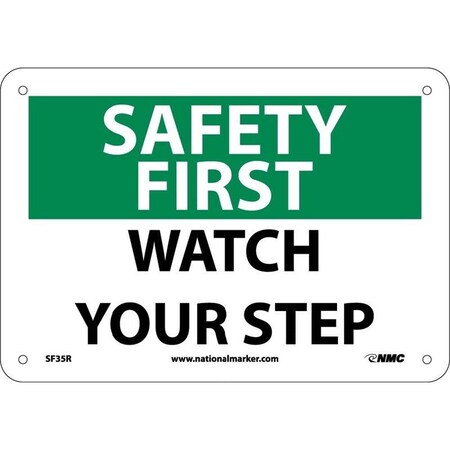 NMC SF35AB OSHA Sign, Legend "SAFETY FIRST - WATCH YOUR STEP", 14" Length x 10" Height, Aluminum, Black/Green on White