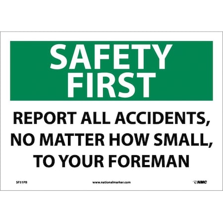 NMC SF51PB OSHA Sign, Legend "SAFETY FIRST - REPORT ALL ACCIDENTS, NO MATTER HOW SMALL, TO YOUR FOREMAN", 14" Length x 10" Height, Pressure Sensitive Vinyl, Black/Green on White