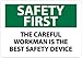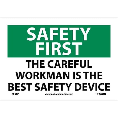 NMC SF57R OSHA Sign, Legend "SAFETY FIRST - THE CAREFUL WORKMAN IS THE BEST SAFETY DEVICE", 10" Length x 7" Height, Rigid Plastic, Black/Green on White