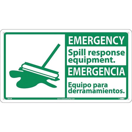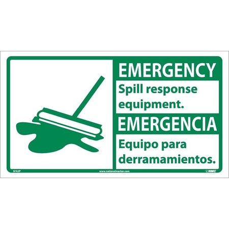 NMC SFA2R Bilingual OSHA Sign, Legend "EMERGENCY- Spill response equipment." with Graphic, 18" Length x 10" Height, Rigid Plastic, Green on White